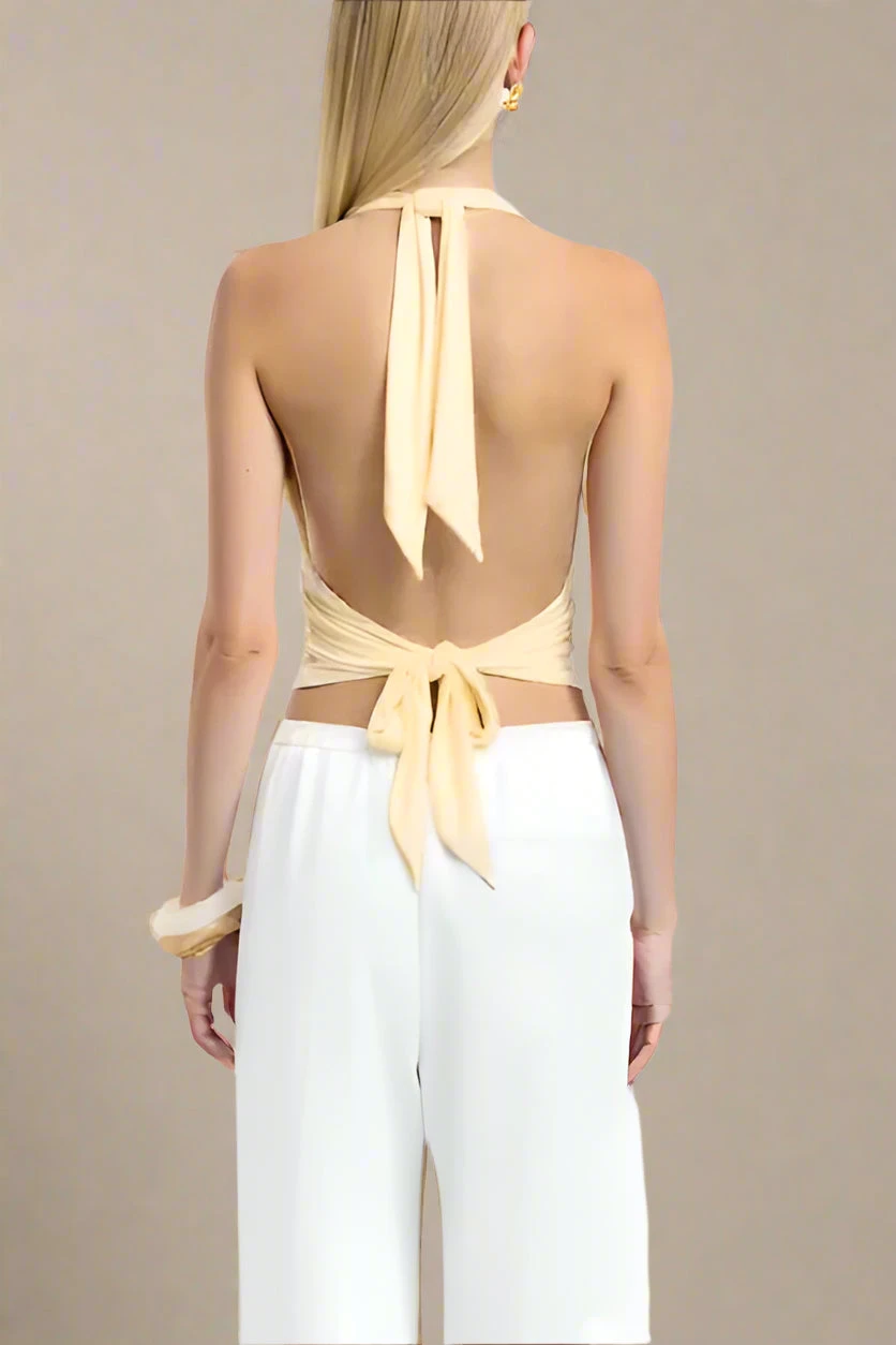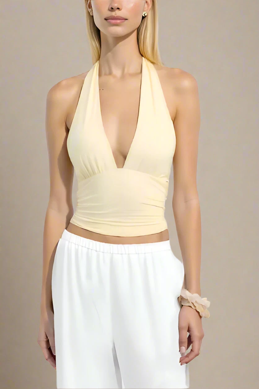 Introducing the Aby Top in Butter Yellow, your new everyday essential. Crafted from our signature soft cotton blend that shows off your figure perfectly. This halter top features a deep V-neckline, flattering ruched details, and chic ties at both the front and waist. Style it with tailored pants for office-ready polish or pair with your favorite jeans for a more laid-back vibe. With sizes ranging from XS to XL, this versatile piece is the perfect building block for your everyday bodycon wardrobe!