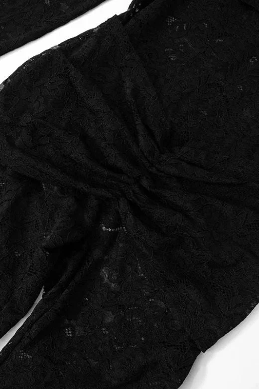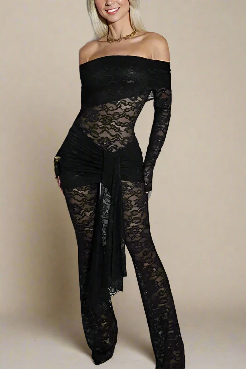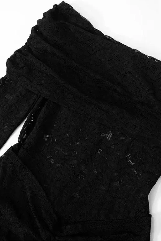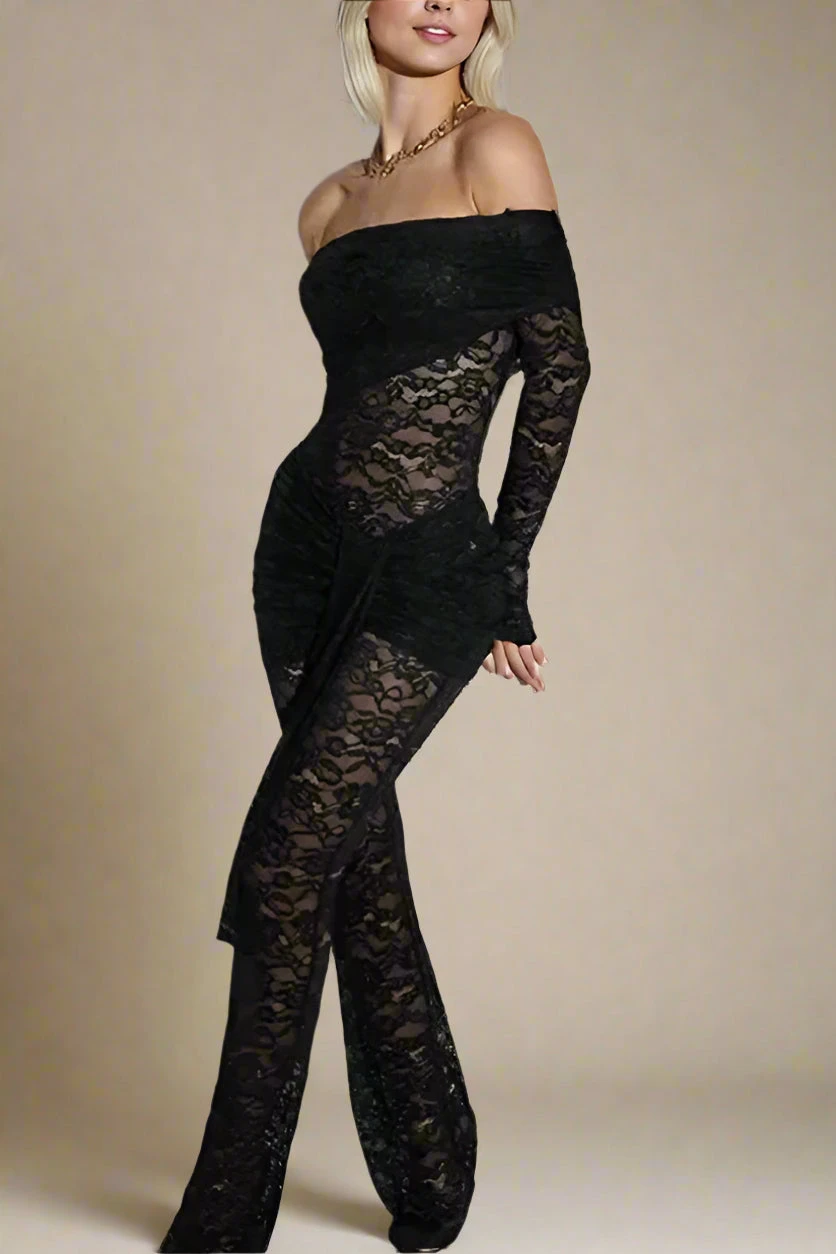 The Andie Long Sleeve Bodycon Wrap Jumpsuit Classic Black is the perfect black lace jumpsuit, featuring stretchy lace polyester fabric, off-the-shoulder neckline, long sleeves, and full length pants. Searching for plus size options? Our bodycon jumpsuits come in a variety of sizes, so you can finally build your dream bodycon wardrobe.