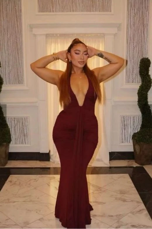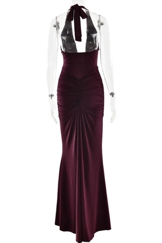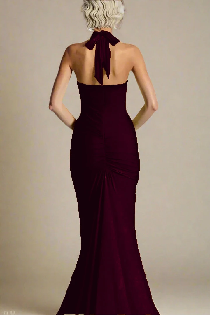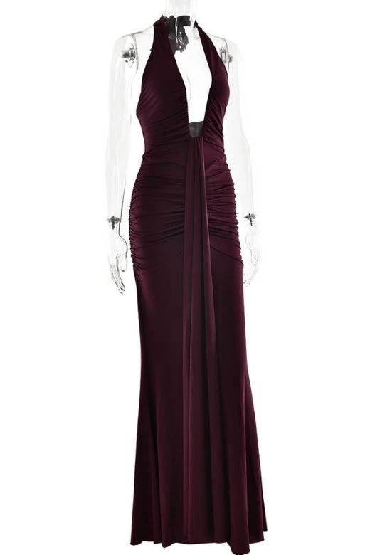 The Bella Bodycon Wrap Maxi Dress in Red Wine is the perfect choice for special occasions, featuring a deep V neckline, a tie-up halter neck, and gathered ruching that flatters your figure. Its elegant maxi length adds a graceful touch. Available in a full range of sizes, our bodycon collection helps you build the perfect wardrobe.Â