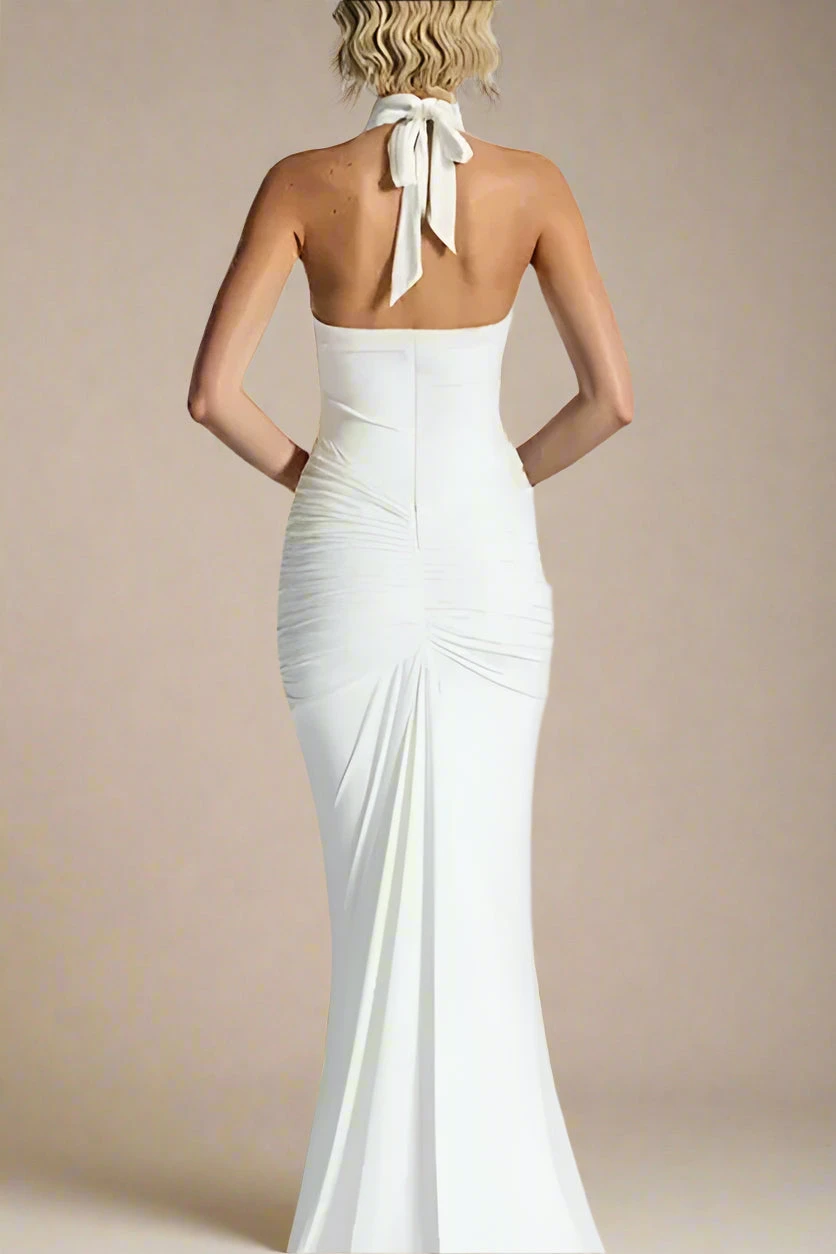 The Bella Bodycon Wrap Maxi Dress in White Pearl is the perfect choice for special occasions, featuring a deep V neckline, a tie-up halter neck, and gathered ruching that flatters your figure. Its elegant maxi length adds a graceful touch. Available in a full range of sizes, our bodycon collection helps you build the perfect wardrobe.