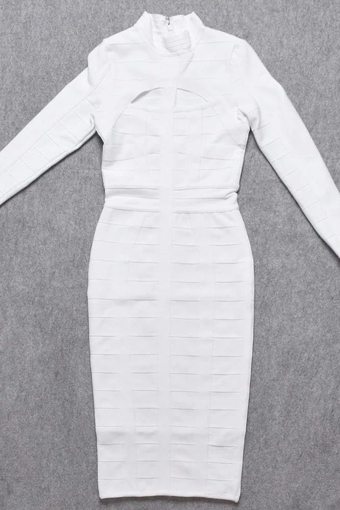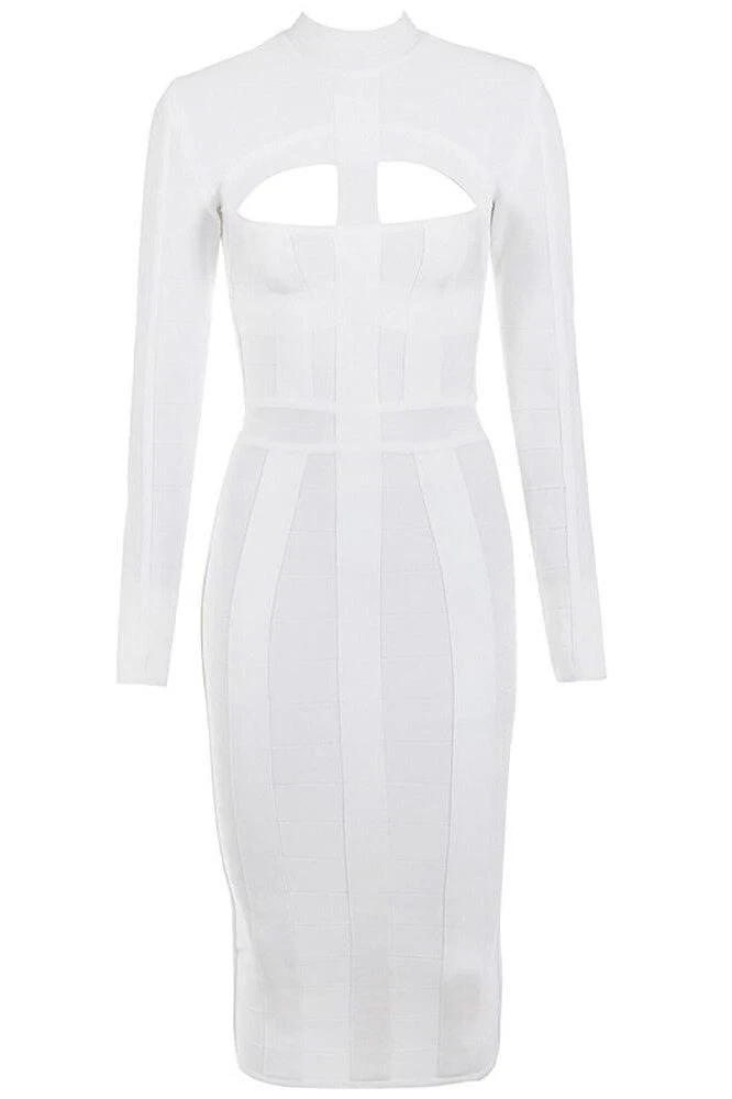 The Brooke Long Sleeve Bandage Dress in White Pearl is perfect for any special event featuring a high neckline, long sleeves, open bust detailing and knee-length finish. More on the plus size? Our bodycon dresses range in all sizes, so get that bodycon wardrobe you’ve always wanted, today.