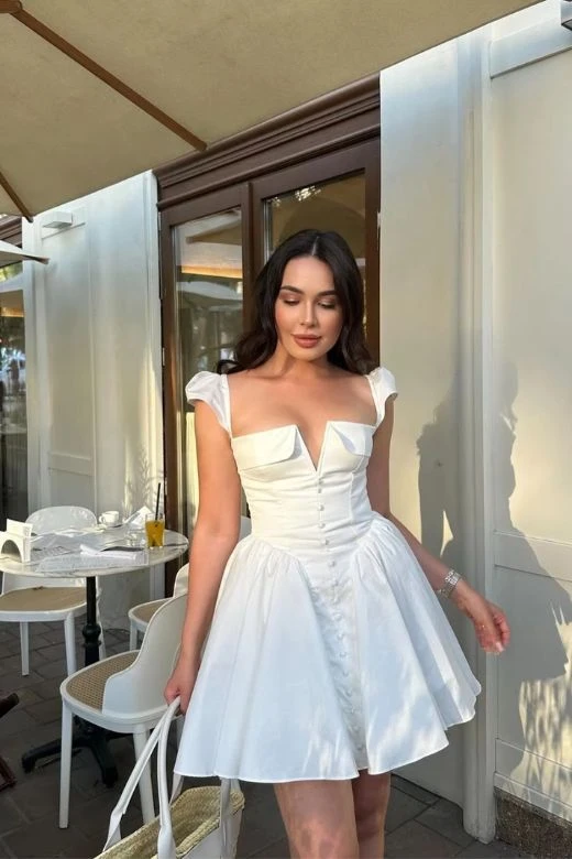 The Cara Bodycon Day Mini Dress in White Pearl is perfect for any special event, with capped short sleeves, v neckline with hard underwire and A-line mini-length finish with tulle detailing. More on the plus size? Our bodycon dresses range in all sizes, so get that bodycon wardrobe you’ve always wanted, today.