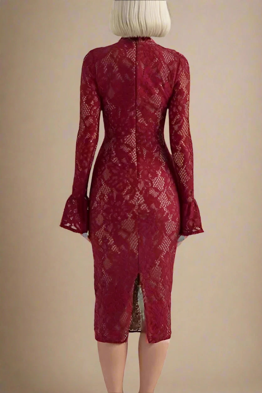 The Charlotte Long Sleeve Bodycon Midi Dress in Chilli Red is ideal for special occasions, featuring a high neck, lace detailing, flared sleeves, and an elegant midi length. Searching for plus size options? Our bodycon dresses come in a variety of sizes, so you can finally build your dream bodycon wardrobe.