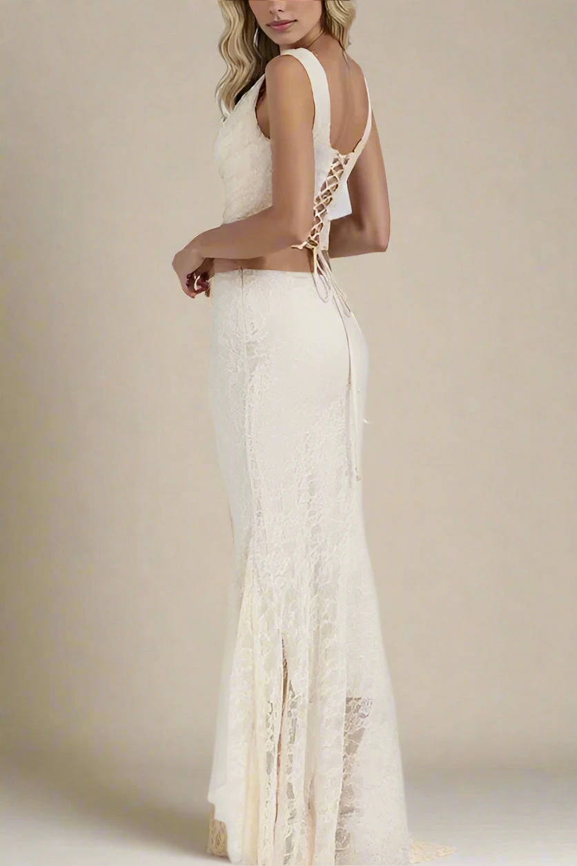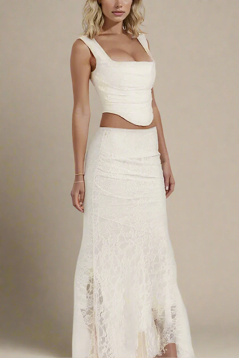 Experience the perfect outfit set for your next special occasion with the Darling Corset Wrap Top and Maxi Skirt Two Piece Skirt Set in Ivory. With floral lace, a square neckline bodice and a tie-up back, this top is crafted from breathable polyester for a comfortable fit with corset underwire. Includes a flattering matching maxi skirt with a mermaid finish. Set comes in various sizes, this outfit set provides a perfect fit for all body shapes.