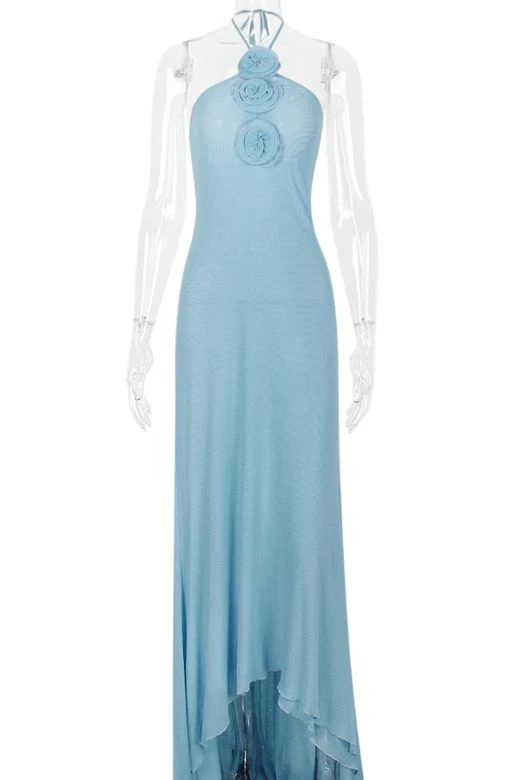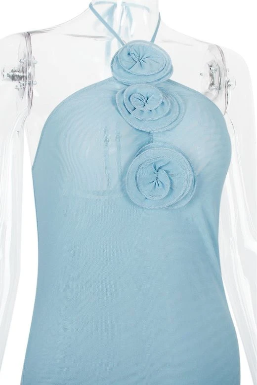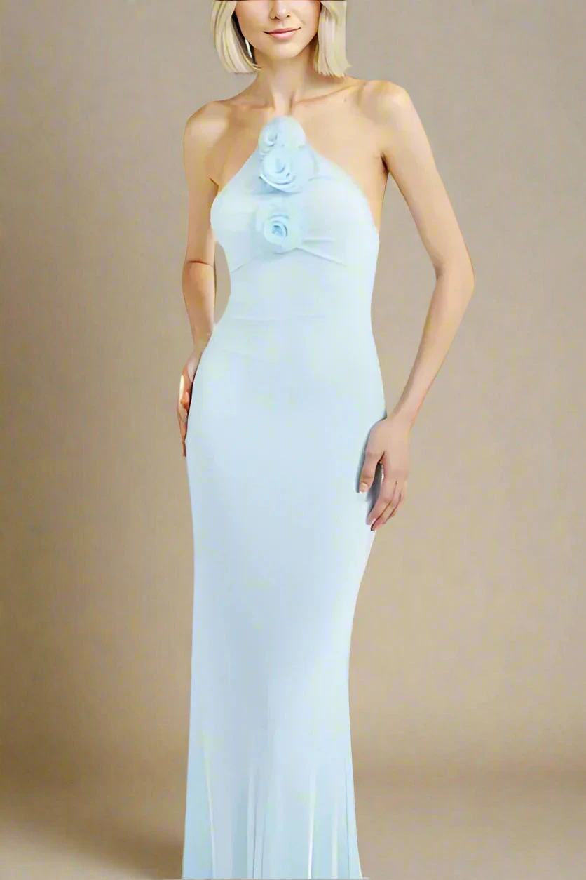 Choose the Baby Blue Ellie Bodycon Maxi Dress for your next holiday occasion. It’s halter straps, open back, and beautiful rose floral detailing add a touch of elegance. With a flattering maxi length and inclusive sizing, our bodycon dresses are perfect for creating your dream wardrobe.