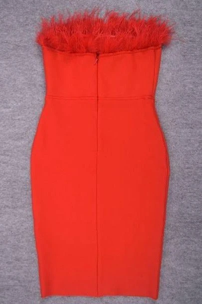 ERIN STRAPLESS FEATHER BANDAGE DRESS IN LIPSTICK RED