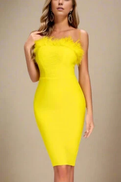 ERIN STRAPLESS FEATHER BANDAGE DRESS IN SUN YELLOW
