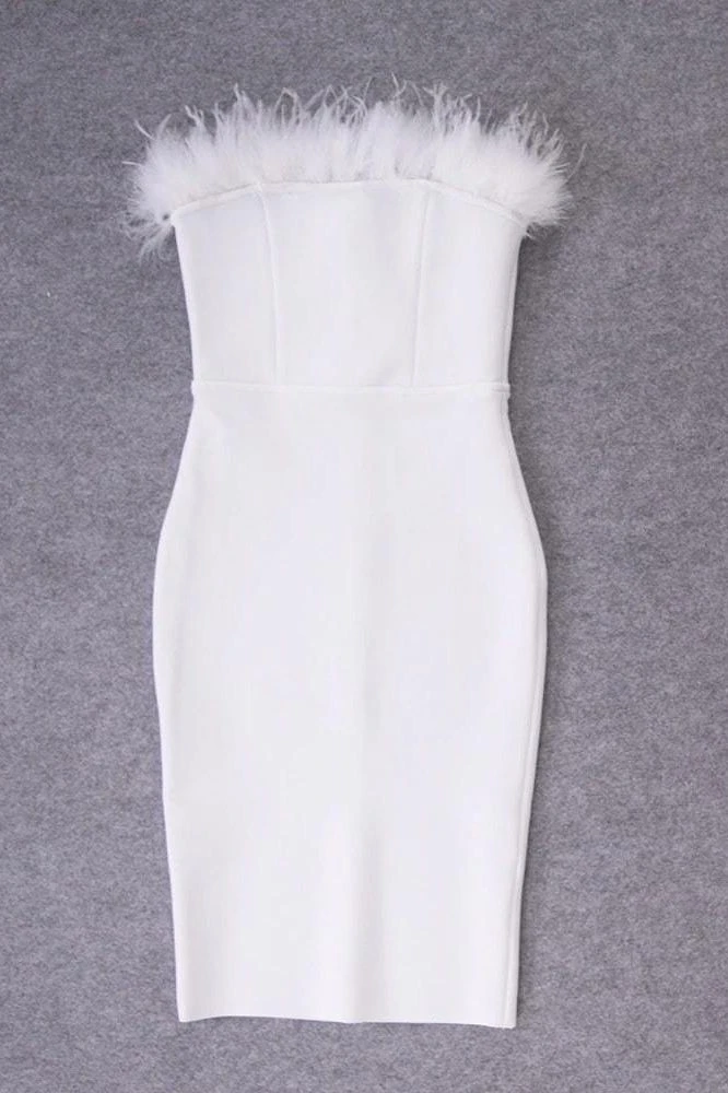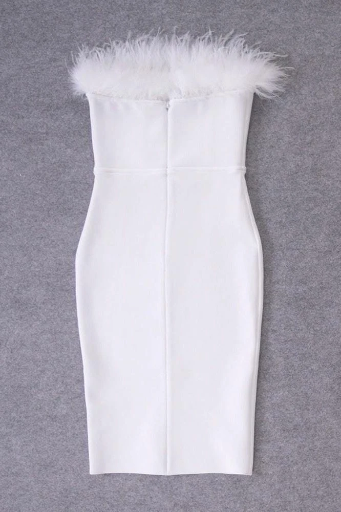 ERIN STRAPLESS FEATHER BANDAGE DRESS IN WHITE PEARL