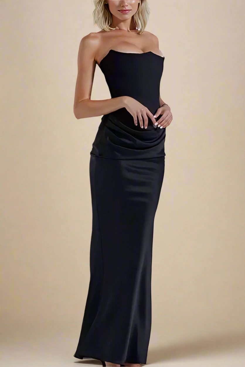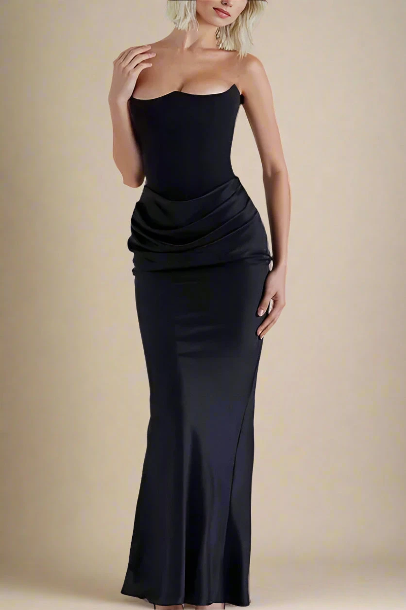 Experience the ultimate elegance with our Hope Bodycon Strapless Maxi Dress in Classic Black. The strapless corset and figure-flattering bodice pair beautifully with satin material, ruched detailing and a pencil skirt for a stunning silhouette look. Our bodycon dresses come in a range of sizes, so you can fulfil your bodycon wardrobe dreams today.