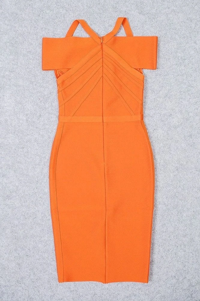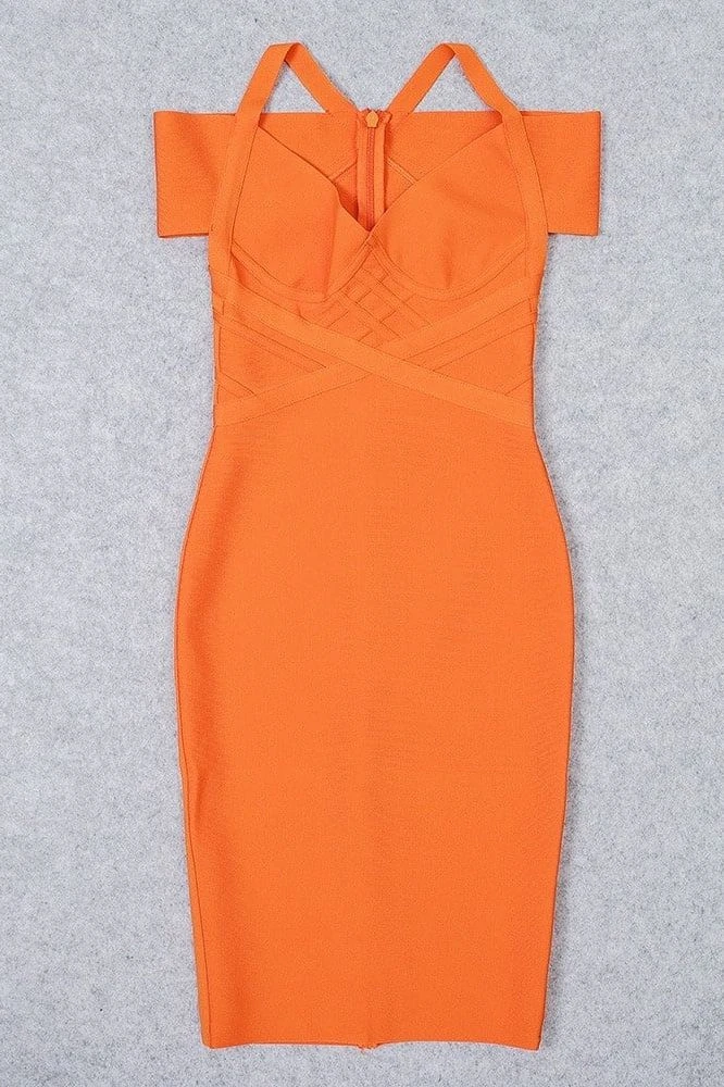 LEO OFF SHOULDER BANDAGE MIDI DRESS IN APRICOT ORANGE