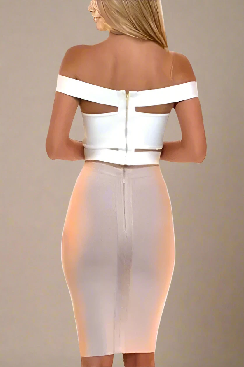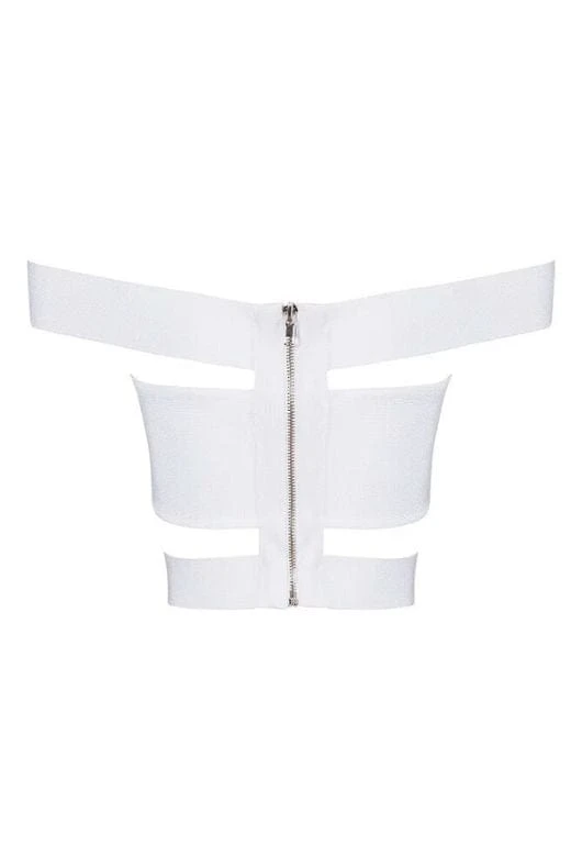 LEXIA OFF SHOULDER BANDAGE CROP TOP IN WHITE PEARL