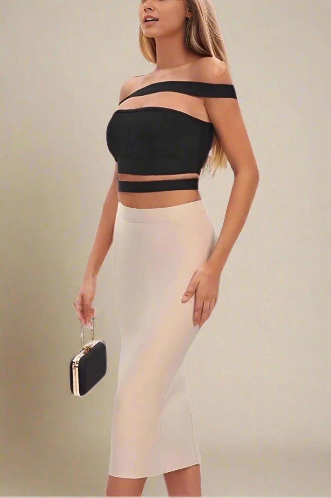 The Lexia Bandage Top and Midi Length Skirt Set in Classic Black and Nude is the perfect two piece skirt set for any special event with off shoulder detailing, cut out bandage wrap style top paired with flattering midi length bandage skirt. More on the plus size? Our bandage sets range in all sizes, so get that bodycon wardrobe you’ve always wanted, today.