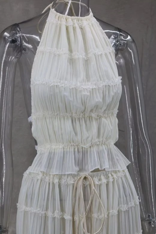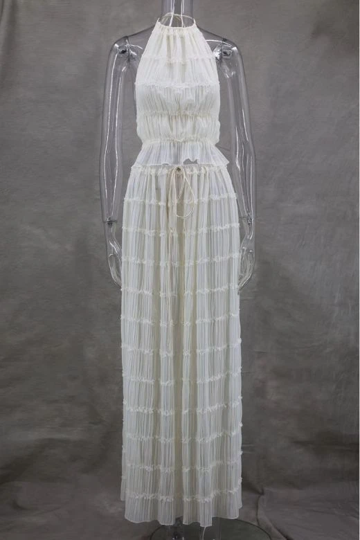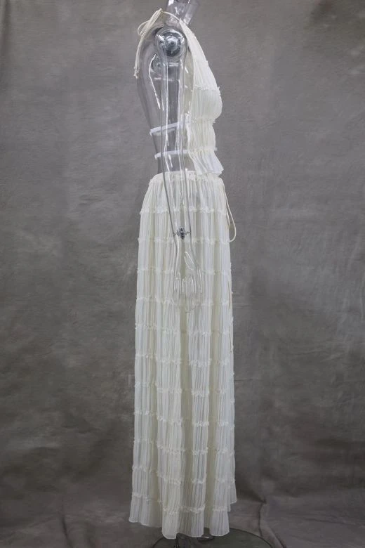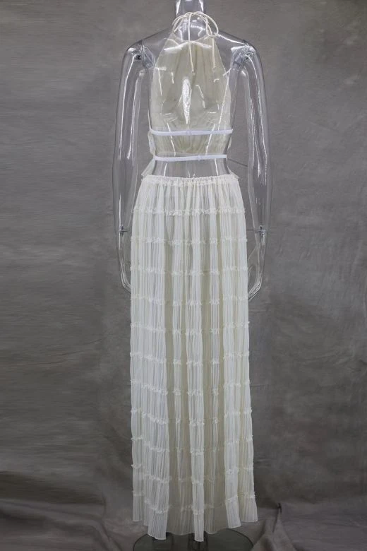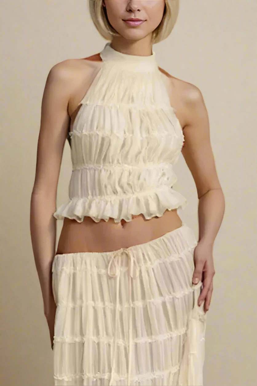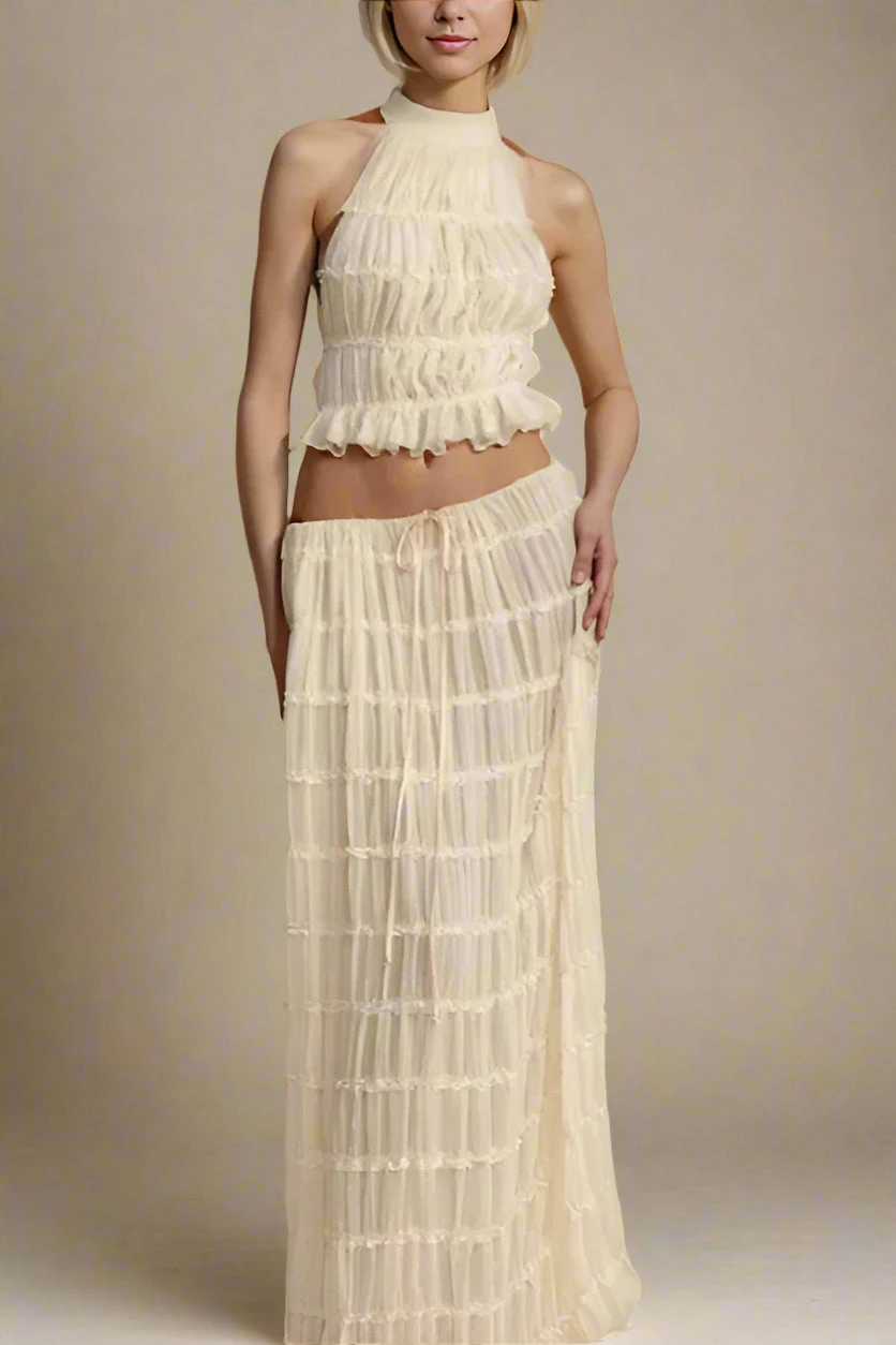 Elevate your next special occasion with the Meryl Wrap Top and Maxi Skirt Set in Cream. The top’s high neckline, open back, and sheer wrap material exude sophistication, while the matching maxi skirt features a pleated finish for added chic. Crafted from breathable polyester, this set is available in various sizes to ensure a perfect fit for all body shapes.