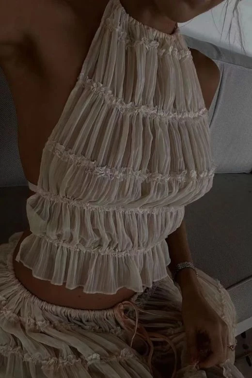 Elevate your next special occasion with the Meryl Wrap Top and Maxi Skirt Set in Sky Blue. The top’s high neckline, open back, and sheer wrap material exude sophistication, while the matching maxi skirt features a pleated finish for added chic. Crafted from breathable polyester, this set is available in various sizes to ensure a perfect fit for all body shapes.