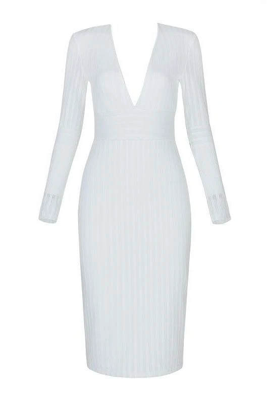 The Olivia Long Sleeve Bandage Midi Dress in White Pearl is perfect for any special event with V neck, long sleeves, high back and midi length feature. More on the plus size? Our bodycon dresses range in all sizes, so get that bodycon wardrobe you’ve always wanted, today.