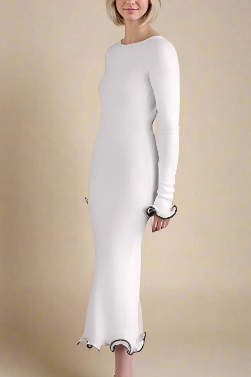 The Regina Long Sleeve Bodycon Maxi Knit Dress in Ivory White is ideal for any occasion. With its high round neckline, long sleeves, and ruffled sleeves and skirt detailing, this dress offers a stylish yet figure-hugging fit. Plus, our bodycon dresses come in a range of sizes, so you can finally achieve the bodycon wardrobe you’ve been dreaming of.
