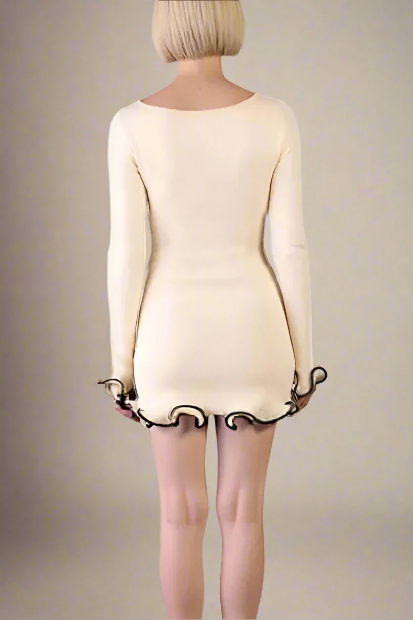 The Regina Long Sleeve Bodycon Mini Knit Dress in Cream is ideal for any occasion. With its high round neckline, long sleeves, and ruffled sleeves and mini skirt detailing, this dress offers a stylish yet figure-hugging fit. Plus, our bodycon dresses come in a range of sizes, so you can finally achieve the bodycon wardrobe you’ve been dreaming of.