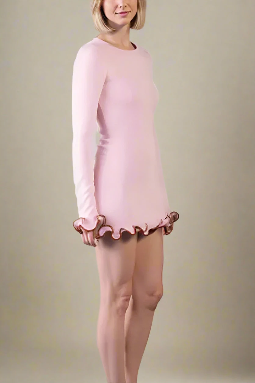 The Regina Long Sleeve Bodycon Mini Knit Dress in Dusty Pink is ideal for any occasion. With its high round neckline, long sleeves, and ruffled sleeves and mini skirt detailing, this dress offers a stylish yet figure-hugging fit. Plus, our bodycon dresses come in a range of sizes, so you can finally achieve the bodycon wardrobe you’ve been dreaming of.