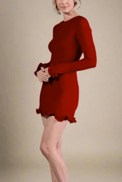 The Regina Long Sleeve Bodycon Mini Knit Dress in Lipstick Red is ideal for any occasion. With its high round neckline, long sleeves, and ruffled sleeves and mini skirt detailing, this dress offers a stylish yet figure-hugging fit. Plus, our bodycon dresses come in a range of sizes, so you can finally achieve the bodycon wardrobe you’ve been dreaming of.