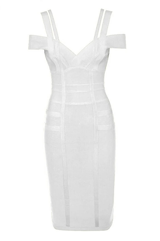 The Sia V Neck Bandage Midi Dress in White Pearl is perfect for any special event with flattering V neck, dual side straps, sculpting bandage bodice and above-knee length finish. More on the plus size? Our bodycon dresses range in all sizes, so get that bodycon wardrobe you’ve always wanted, today.