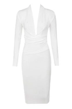 The Zia Bodycon Wrap Style Midi Dress in White Pearl is the perfect white wrap dress for any special event with off shoulder drape style straps, wrap ruched bodice and over knee midi finish. More on the plus size? Our bodycon dresses range in all sizes, so get that bodycon wardrobe you’ve always wanted, today.